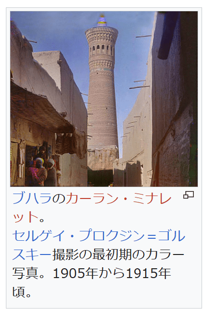 ブハラのカーラン・ミナレット。 セルゲイ・プロクジン=ゴルスキー撮影の最初期のカラー写真。1905年から1915年頃。 この地方のムスリム(イスラム教徒)は異族人(英語版)に分類されて伝統的な風俗習慣に基づく自治が許され、総督府は治安と徴税のみに専念した[392]。トルキスタン総督府の地域では綿花産業を拡大させ、この地域はロシアのモノカルチャー植民地となった[393]。