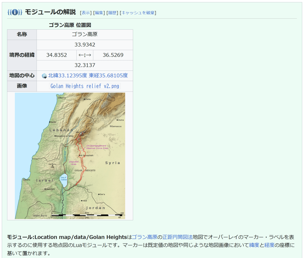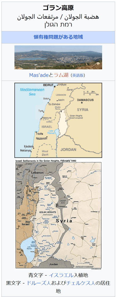 脚注・出典 ^ “Golan Heights profile”. 英国放送協会 (2015年11月27日). 2017年9月13日閲覧。 ^ “Golan Heights”. 『ブリタニカ百科事典』 (2013年5月1日). 2017年9月13日閲覧。 ^ “Citypopulation.de/Golan” (2017年9月10日). 2017年9月13日閲覧。 ^ 日本政府機関はゴラン高原の名称を使用。外務省UNDOFの概要、ゴラン高原における衝突の発生について。防衛省 ゴラン高原派遣輸送隊。内閣府ゴラン高原国際平和協力業務、ゴラン高原国際平和協力隊の設置等に関する政令 ^ “ゴラン高原”. 内閣府ホームページ. 2024年8月10日閲覧。 ^ a b 【on the scene 現場を旅する】ゴラン高原「危険地帯」か「観光地」か『朝日新聞グローブ』No.240(2021年4月)2021年4月11日閲覧 ^ a b c d e f g 「ゴラン高原 占領固定化/栄える観光業 イスラエル国籍望む若者」『読売新聞』朝刊2019年6月9日(国際面)2019年6月11日閲覧 ^ 「占領地、迫るイランの脅威=ロケット標的のゴラン高原-イスラエル」時事通信(2018年5月27日)2018年9月3日閲覧 ^ 「露、じわりイラン離れ/シリア アサド政権存続公算で/イスラエル周辺の安定に配慮」『産経新聞』朝刊2018年8月4日(国際面)2018年9月3日閲覧 ^ “米、ゴラン高原のイスラエル主権認定 トランプ氏が表明”. AFPBB News. フランス通信社. (2019年3月22日) 2019年3月22日閲覧。 ^ “ゴラン高原「シリアに帰属」=イスラエル主権承認、米に批判”. AFPBB News. フランス通信社. (2019年3月22日) 2019年3月22日閲覧。 ^ “ゴラン高原のイスラエル主権承認、トランプ氏が宣言に署名”. AFPBB News. フランス通信社. (2019年3月26日) 2019年3月26日閲覧。 ^ “米、イスラエル主権を正式承認=ゴラン高原、国連「地位不変」”. 時事ドットコム. 時事通信社. (2019年3月26日) 2019年3月26日閲覧。 ^ “イスラエルのゴラン高原併合「我が国は認めず」 菅長官”. 『朝日新聞』. (2019年3月26日) 2019年3月26日閲覧。 ^ “イスラエルがゴラン高原に新入植地、「トランプ高原」と命名”. wsj.com. ウォール・ストリート・ジャーナル. (2019年6月17日) 2019年6月17日閲覧。 ^ “イスラエル軍、ヒズボラ拠点を報復攻撃 全面戦争の懸念強まる”. CNN (2024年7月29日). 2024年7月29日閲覧。 外部リンク