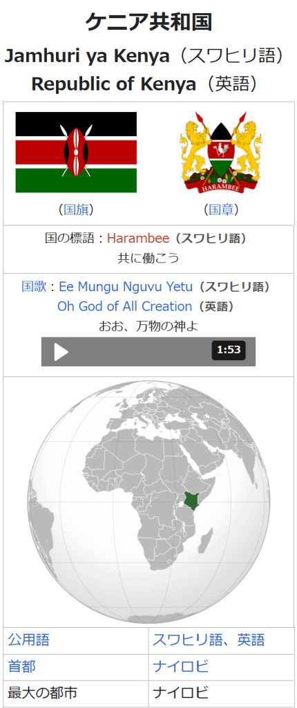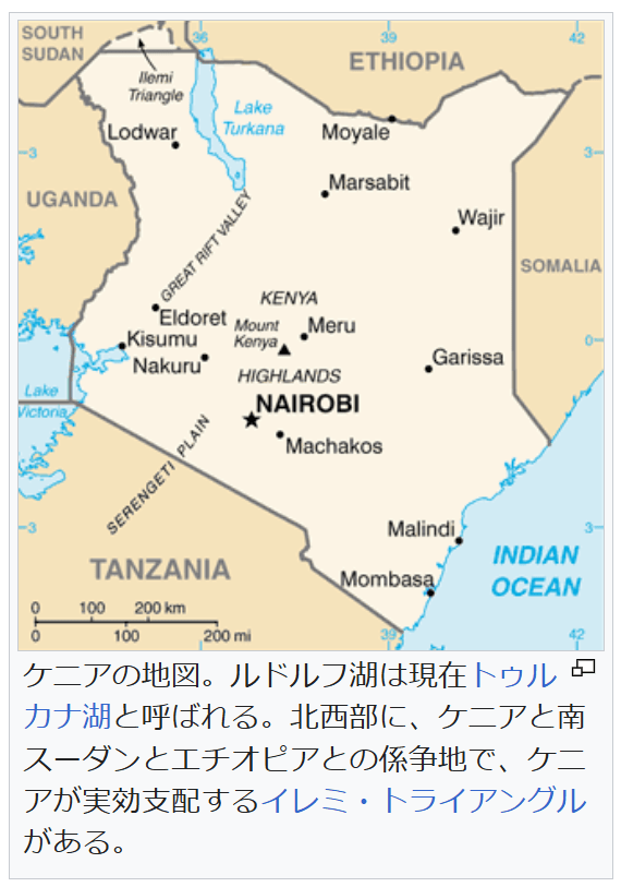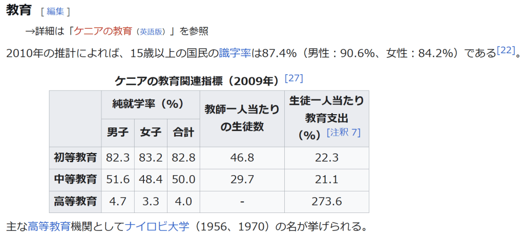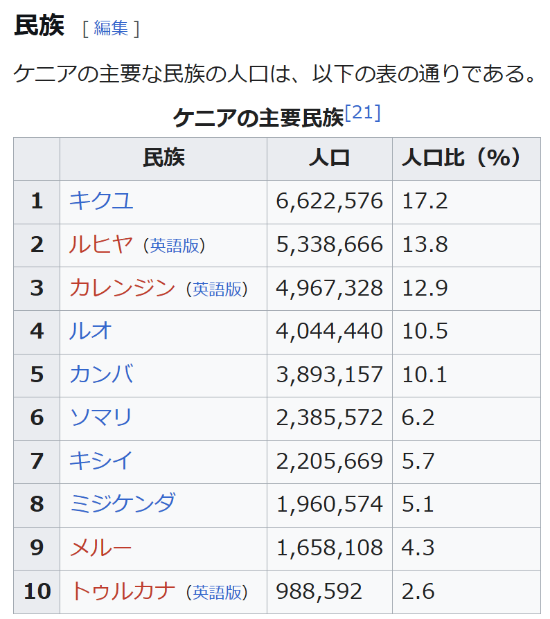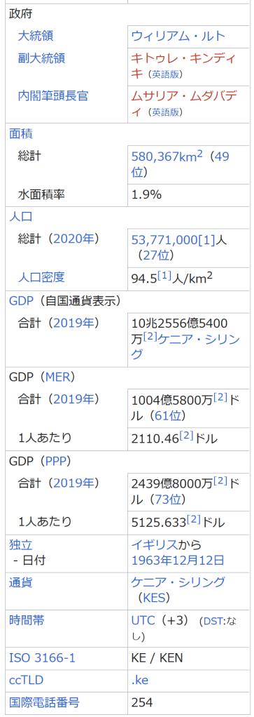 脚注 [脚注の使い方] 注釈 ^ 発音 [ʄɑmˈhuˑrijaˈkɛɲɑ]、ジャムフリ・ヤ・ケニャ ^ 発音: [rɪˈpʌb·lɪk əv ˈken.jə]、リパブリック・オヴ・ケンニャ ^ 大統領、上院議員(Senator)、カウンティの知事、国会議員などを選出。 ^ County Governments Act No.17 of 2012 ^ ルイヤ語はさらに14の言語に分類することができ、主なものとしてブクス語(約140万人)、ロゴーリ語(英語版)(約62万人)、イダホ=イスハ=ティリキ語(英語版)などがある。 ^ カレンジン語は幾つかの言語をまとめた方言群であり、キプシギス語(英語版)(約190万人)、ナンディ語(約95万人)などを含む。 ^ 一人当たりGDPに対する生徒一人当たり公共教育支出額の割合。初等・中等教育は2006年、高等教育は2004年の数値。 出典 ^ a b “UNdata”. 国連. 2021年10月10日閲覧。 ^ a b c d e [1](2021年10月17日閲覧) ^ “アフリカで一番高い山はどこ? – アフリカ大陸最高峰”. http://www.tabi2ikitai.com. 2022年12月22日閲覧。 ^ a b Kokusai jōhō daijiten : Pasupo = Paspo.. Gakushū Kenkyūsha, 学習研究社. (Shohan ed.). Tōkyō: Gakken. (1992). ISBN 4-05-106027-6. OCLC 31669709 ^ “ケニア選挙やり直しの英断、司法独立への期待に火 アフリカ初の無効判決、一躍国民のヒーローになった最高裁判事” (2017年9月7日). 2017年9月18日閲覧。 ^ ケニア大統領選 副大統領「勝利」対立陣営、敗北認めず『東京新聞』朝刊2022年8月17日国際面掲載の共同通信記事(2022年8月22日閲覧) ^ 「元首相、大統領選結果拒否 ケニア、法的措置も示唆」東京新聞 TOKYO Web 2022年8月16日配信の共同通信記事(2022年8月22日閲覧) ^ Expensive Tokyo embassy leads to Kenyan resignations RFI, 27/10/2010 ^ 「在日ケニア大使館、不当に高い? 反汚職委が経緯調査」共同通信(2010年10月20日) ^ a b c 外務省 ケニア基礎データ ^ “ケニアで地方分権が始まる。日本が支援する、分権実施に向けた人材育成もスタート”. 国際協力機構. 2014年10月24日閲覧。 ^ “World Development Indicators”. World Bank. 2014年10月11日閲覧。 ^ a b “Kenya Vision 2030”. Republic of Kenya. 2014年10月11日閲覧。 ^ “FAOSTAT”. Food and Agriculture Organization. 2014年10月11日閲覧。 ^ 『日本経済新聞』2013年12月19日【初歩からのアフリカ】ケニアの園芸産業に続け ^ “密猟ではなくアボカド…ケニアのゾウに新たな脅威”. AFP (2021年4月17日). 2021年4月18日閲覧。 ^ a b “海外ビジネス情報:ケニア”. 日本貿易振興機構. 2014年10月11日閲覧。 ^ [2] ^ “ケニアの憂鬱 モバイルマネー先進国襲った ギャンブル依存症の罠” (2022年5月19日). 2024年1月8日閲覧。 ^ NICHOLE SOBECKI (2020年4月16日). “アフリカの大都市、ナイロビの新型コロナ対策 外出禁止令で格差が浮き彫りに”. ナショナルジオグラフィック 2020年4月17日閲覧。 ^ a b c “2009 POPULATION & HOUSING CENSUS RESULTS”. Minister of State for Planning, National Development and Vision 2030. 2014年10月11日閲覧。 ^ a b The World Factbook2014年10月11日閲覧 ^ 松田素二「民族対立の社会理論」『現代アフリカの紛争を理解するために』アジア経済研究所 1998年 ^ 宮本正興「アフリカの言語 その生態と機能」『ハンドブック現代アフリカ』岡倉登志編 明石書店、2002年12月 ^ Lewis, M. Paul, Gary F. Simons, and Charles D. Fennig (eds.). 2015. Ethnologue: Languages of the World, Eighteenth edition. Dallas, Texas: SIL International. Online version: http://www.ethnologue.com. ^ Why don’t some women take their husbands’ names after marriage?, The STAR, Sep 19, 2015. ^ The World Bank (2013), Africa Development Indicators 2012/13 ^ “ケニア 安全対策基礎データ「犯罪発生状況、防犯対策」”. 外務省. 2021年12月5日閲覧。 ^ “ケニアでもオバマ氏勝利を祝福、6日は「国民祝日」に”. AFPBB News (2008年11月6日). 2009年6月2日閲覧。 参考文献 砂野幸稔 著「アフリカ文化のダイナミズム」、岡倉登志 編『ハンドブック現代アフリカ』明石書店、東京、2002年12月。 宮本正興 著「アフリカの言語――その生態と機能」、岡倉登志 編『ハンドブック現代アフリカ』明石書店、東京、2002年12月。 関連項目 ケニア関係記事の一覧 ケニア海軍艦艇一覧 ケニア植民地 マウマウ団の乱 ケニアの政治(英語版) ケニア危機 (2007年-2008年) イレミ・トライアングル バラク・オバマ ケニアのスポーツ ケニアのサッカー(英語版) マイケル・オルンガ オリンピックのケニア選手団 少年ケニヤ 外部リンク