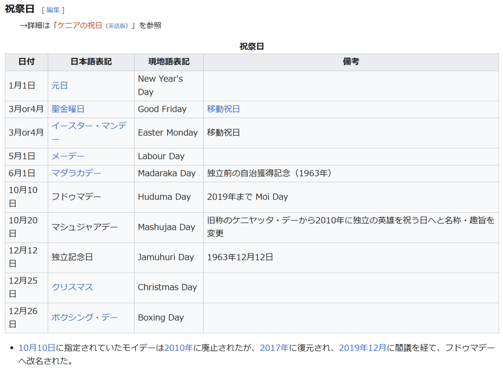 ミジケンダのカヤの聖なる森林群(2008年、文化遺産) ミジケンダのカヤの聖なる森林群(2008年、文化遺産) 祝祭日 →詳細は「ケニアの祝日(英語版)」を参照 祝祭日 日付 日本語表記 現地語表記 備考 1月1日 元日 New Year’s Day 3月or4月 聖金曜日 Good Friday 移動祝日 3月or4月 イースター・マンデー Easter Monday 移動祝日 5月1日 メーデー Labour Day 6月1日 マダラカデー Madaraka Day 独立前の自治獲得記念(1963年) 10月10日 フドゥマデー Huduma Day 2019年まで Moi Day 10月20日 マシュジャアデー Mashujaa Day 旧称のケニヤッタ・デーから2010年に独立の英雄を祝う日へと名称・趣旨を変更 12月12日 独立記念日 Jamuhuri Day 1963年12月12日 12月25日 クリスマス Christmas Day 12月26日 ボクシング・デー Boxing Day 10月10日に指定されていたモイデーは2010年に廃止されたが、2017年に復元され、2019年12月に閣議を経て、フドゥマデーへ改名された。 スポーツ →詳細は「ケニアのスポーツ」を参照 ケニア国内では、陸上競技とサッカーが最も人気のスポーツとなっている。とりわけ陸上競技の長距離走の人気は高く、隣国エチオピアと並んで世界屈指の強豪国として知られている。2008年北京五輪・男子マラソンの金メダリストサムエル・ワンジルをはじめ、オリンピックや世界陸上などでは優勝者を輩出している。