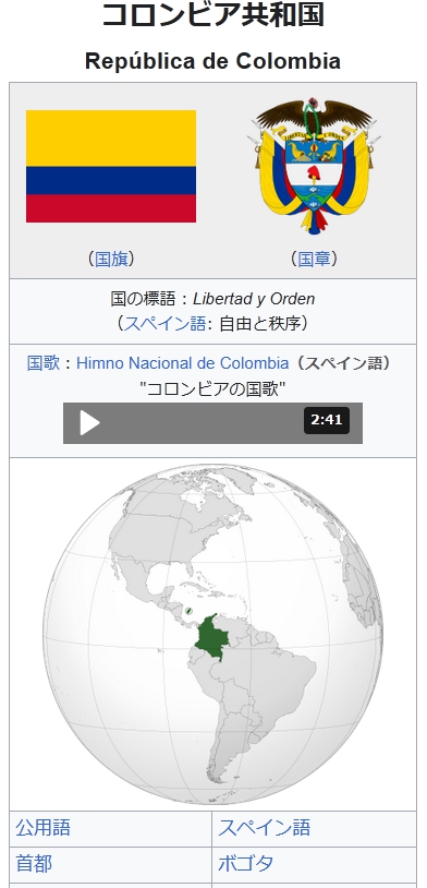 コロンビア共和国 República de Colombia コロンビアの国旗 コロンビアの国章 (国旗) (国章) 国の標語:Libertad y Orden (スペイン語: 自由と秩序) 国歌:Himno Nacional de Colombia(スペイン語) “コロンビアの国歌” Duration: 2 minutes and 41 seconds.2:41 コロンビアの位置 公用語 スペイン語 首都 ボゴタ 最大の都市 ボゴタ