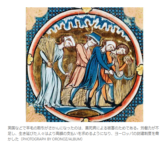 英国などで羊毛の取引がさかんになったのは、黒死病による被害のためである。労働力が不足し、生き延びた人々はより高額の支払いを求めるようになり、ヨーロッパの封建制度を脅かした(PHOTOGRAPH BY ORONOZ/ALBUM) (文 ANTONI VIRGILI、訳 三枝小夜子、日経ナショナル ジオグラフィック社)