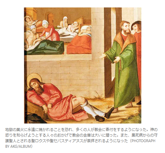 地獄の業火に永遠に焼かれることを恐れ、多くの人が教会に寄付をするようになった。神の怒りを和らげようとする人々のおかげで教会の金庫は大いに潤った。また、黒死病からの守護聖人とされる聖ロクスや聖セバスティアヌスが崇拝されるようになった(PHOTOGRAPH BY AKG/ALBUM)