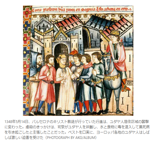 1348年5月14日、バルセロナのキリスト教徒が行っていた行進は、ユダヤ人居住区域の襲撃に変わった。虐殺のきっかけは、司祭がユダヤ人を非難し、水と食物に毒を混入して黒死病を引き起こしたと主張したことだった。ペストを口実に、ヨーロッパ各地のユダヤ人はしばしば激しい迫害を受けた(PHOTOGRAPH BY AKG/ALBUM)