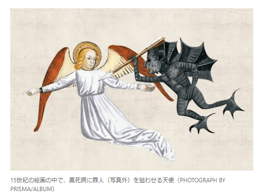 15世紀の絵画の中で、黒死病に罪人(写真外)を狙わせる天使(PHOTOGRAPH BY PRISMA/ALBUM)