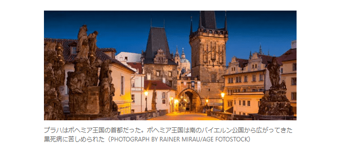 プラハはボヘミア王国の首都だった。ボヘミア王国は南のバイエルン公国から広がってきた黒死病に苦しめられた(PHOTOGRAPH BY RAINER MIRAU/AGE FOTOSTOCK) 当時の町では「すぐに逃げろ、急いで遠くに行け、戻るのはあとにするほどよい」と言われていた。この助言にしたがって避難する余裕がある人々の多くが田舎に逃げたため、悲惨な結果になった。避難した人々もすでに感染していたり、感染者と一緒に旅をしたりしたため、自分たちが助からなかったばかりか、それまで感染者がいなかった遠隔地の村に病気を持ち込むことになってしまったのだ。