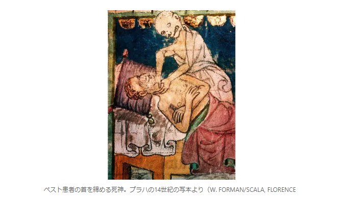 ペスト患者の首を締める死神。プラハの14世紀の写本より(W. FORMAN/SCALA, FLORENCE リンパ節が腫れ上がるペストは「腺ペスト」と呼ばれる。しかし、これはペストの3つの病型のなかの最も一般的なものにすぎない。第2の病型である敗血症性ペストはペスト菌が血液中に入ったもので、皮膚の下に黒い斑点が現れ、おそらく「黒死病(Black Death)」という名前の由来となった。肺ペストでは呼吸器系がおかされ、患者は激しく咳き込むので、飛沫感染しやすい。中世には敗血症性ペストと肺ペストの致死率は100%だったと言われる。