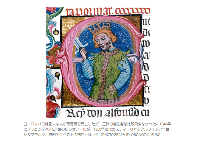 ヨーロッパでは膨大な人が黒死病で死亡したが、王族の犠牲者は比較的少なかった。1348年にアラゴン王ペドロ4世の妃レオノールが、1350年にはカスティーリャ王アルフォンソ11世がジブラルタル攻略中にペストの犠牲となった(PHOTOGRAPH BY ORONOZ/ALBUM)