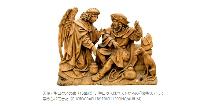 天使と聖ロクスの像(16世紀)。聖ロクスはペストからの守護聖人として崇められてきた(PHOTOGRAPH BY ERICH LESSING/ALBUM) 黒死病は、生き延びた人々の生活や意識を一変させた。農民も王子も同じように黒死病に倒れたことから、当時の文献には、黒死病の前では身分の差などなんの意味もないという思想が繰り返し登場する。