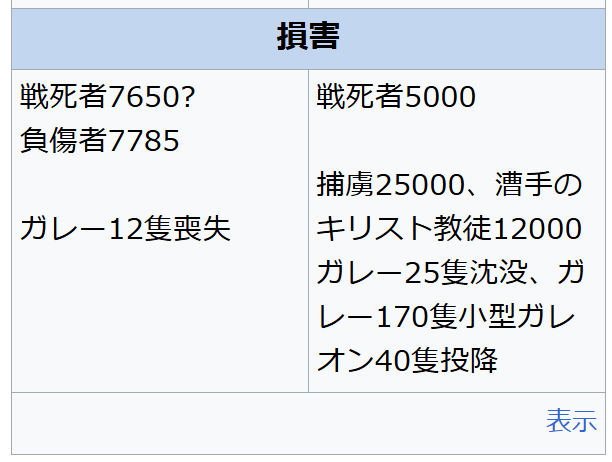 関連作品 小説 塩野七生『レパントの海戦』(新潮文庫) 歴史ゲーム The battle of Lepanto, Robert Cowling, Strategy and Tactics 272, 2011 脚注 [脚注の使い方] ^ “(スペイン語) Julián Jaramillo, La batalla de Lepanto (historia-maritima.blogspot.com, 2012)”. 2020年7月4日閲覧。 ^ a b c ジェフリ・パーカー, 『長篠合戦の世界史 ヨーロッパ軍事革命の衝撃 1500~1800年 』, 同文館, p. 121 ^ “デジタル大辞泉の解説”. コトバンク. 2018年2月18日閲覧。 参考文献 岩根圀和『物語スペインの歴史──海洋帝国の黄金時代』中央公論社、東京〈中公新書1635〉、2002年2月。ISBN 9784-12-101635-5。 Abulafia, David (2012). The Great Sea: A Human History of the Mediterranean. New York: Penguin Books. ISBN 978-0-19931-599-4 Anderson, R. C. Naval Wars in the Levant 1559–1853, (2006), ISBN 1-57898-538-2 Archer, Christon; Ferris, John R.; Herwig, Holger H.; Travers, Timothy H.E. (2002). World History of Warfare. Lincoln: University of Nebraska Press. ISBN 978-0-80321-941-0 Beeching, Jack. The Galleys at Lepanto, Hutchinson, London, 1982; ISBN 0-09-147920-7 Bicheno, Hugh. Crescent and Cross: The Battle of Lepanto 1571, pbk., Phoenix, London, 2004, ISBN 1-84212-753-5 Capponi, Niccolò (2006). Victory of the West:The Great Christian-Muslim Clash at the Battle of Lepanto. New York: Da Capo Press. ISBN 0-306-81544-3 Braudel, Fernand. The Mediterranean in the Age of Philip II. (vol 2 1972), the classic history by the leader of the French Annales School; excerpt and text search vol 2 pp 1088–1142 Chesterton, G. K. Lepanto with Explanatory Notes and Commentary, Dale Ahlquist, ed. (San Francisco: Ignatius Press, 2003). ISBN 1-58617-030-9 Clissold, Stephen (1966). A short history of Yugoslavia. Cambridge: Cambridge University Press. ISBN 0-521-04676-9 Cakir, İbrahim Etem, “Lepanto War and Some Informatıon on the Reconstructıon of The Ottoman Fleet”, Turkish Studies – International Periodical For The Language Literature and History of Turkish or Turkic, Volume 4/3 Spring 2009, pp. 512–31 Contarini, Giovanni Pietro. Kiril Petkov, ed and trans. From Cyprus to Lepanto: History of the Events, Which Occurred from the Beginning of the War Brought against the Venetians by Selim the Ottoman, to the Day of the Great and Victorious Battle against the Turks. Italica Press, 2019. ISBN 978-1-59910-381-5, 978-1-59910-382-2 Cook, M.A. (ed.), “A History of the Ottoman Empire to 1730”, Cambridge University Press, 1976; ISBN 0-521-20891-2 Crowley, Roger Empires of the Sea: The siege of Malta, the battle of Lepanto and the contest for the center of the world, Random House, 2008. ISBN 978-1-4000-6624-7 Currey, E. Hamilton, “Sea-Wolves of the Mediterranean”, John Murrey, 1910 Davis, Paul K. (1999). 100 Decisive Battles: From Ancient Times to the Present. New York: Oxford University Press. ISBN 978-0-19514-366-9 Davis, Robert C. (2009). Holy War and Human Bondage. Santa Barbara: ABC-CLIO. ISBN 978-0-27598-950-7 Guilmartin, John F. (1974) Gunpowder & Galleys: Changing Technology & Mediterranean Warfare at Sea in the 16th Century. Cambridge University Press, London. ISBN 0-521-20272-8. Guilmartin, John F. (2003). Galleons and Galleys: Gunpowder and the Changing Face of Warfare at Sea, 1300–1650. Cassell. ISBN 0-304-35263-2 Hanson, Victor D. Carnage and Culture: Landmark Battles in the Rise of Western Power, Anchor Books, 2001. Published in the UK as Why the West has Won, Faber and Faber, 2001. ISBN 0-571-21640-4. Includes a chapter about the battle of Lepanto Hanson, Victor Davis (2010). The Father of Us All: War and History, Ancient and Modern. New York: Bloomsbury Press. ISBN 978-1-60819-410-0 Hess, Andrew C. “The Battle of Lepanto and Its Place in Mediterranean History”, Past and Present, No. 57. (Nov., 1972), pp. 53–73 Hopkins, T.C.F. (2006). Confrontation at Lepanto: Christendom vs. Islam. New York: Forge Books. ISBN 978-0-76530-539-8 Konstam, Angus, Lepanto 1571: The Greatest Naval Battle of the Renaissance. Osprey Publishing, Oxford. 2003. ISBN 1-84176-409-4 Stevens, William Oliver and Allan Westcott (1942). A History of Sea Power. Doubleday Harbottle’s Dictionary of Battles, third revision by George Bruce, 1979 Parker, Geoffrey (1996) The Military Revolution: Military Innovation and the Rise of the West, 1500–1800. (second edition) Cambridge University Press, Cambridge. ISBN 0-521-47426-4 Stouraiti, Anastasia, ‘Costruendo un luogo della memoria: Lepanto’, Storia di Venezia – Rivista 1 (2003), 65–88. Warner, Oliver Great Sea Battles (1968) has “Lepanto 1571” as its opening chapter. ISBN 0-89673-100-6 The New Cambridge Modern History, Volume I – The Renaissance 1493–1520, edited by G. R. Potter, Cambridge University Press 1964 refWheatcroft2004Wheatcroft, Andrew (2004). Infidels: A History of the Conflict between Christendom and Islam. Penguin Books. J. P. Jurien de la Gravière, La Guerre de Chypre et la Bataille de Lépante (1888). Luis Coloma, The Story of Don John of Austria, trans. Lady Moreton, New York: John Lane Company, 1912 (online transcription of pp. 265–71). Christopher Check, The Battle that Saved the Christian West, This Rock 18.3 (March 2007). Lepanto – Rudolph, Harriet, “Die Ordnung der Schlacht und die Ordnung der Erinnerung” in: Militärische Erinnerungskulturen vom 14. bis zum 19. Jahrhundert (2012), 101–28. Guilmartin, John F. “The Tactics of the Battle of Lepanto Clarified: The Impact of Social, Economic, and Political Factors on Sixteenth Century Galley Warfare”, in Craig L. Symonds (ed.), New Aspects of Naval History: Selected Papers Presented at the Fourth Naval History Symposium, United States Naval Academy 25–26 October 1979, Annapolis, Maryland: the United States Naval Institute (1981), 41–65. 関連項目