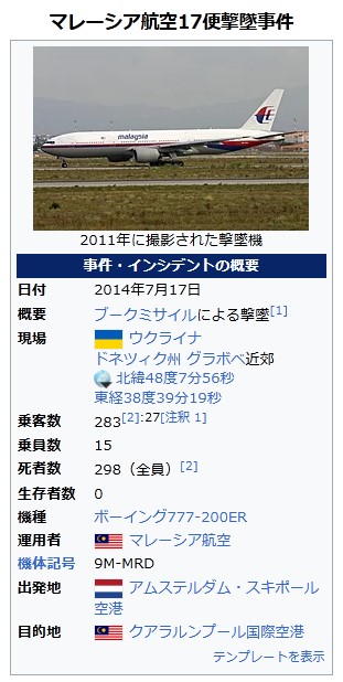 マレーシア航空17便撃墜事件https://ja.wikipedia.org/wiki/%E3%83%9E%E3%83%AC%E3%83%BC%E3%82%B7%E3%82%A2%E8%88%AA%E7%A9%BA17%E4%BE%BF%E6%92%83%E5%A2%9C%E4%BA%8B%E4%BB%B6