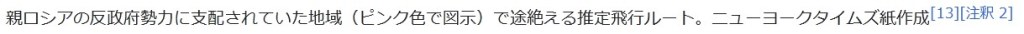 親ロシアの反政府勢力に支配されていた地域(ピンク色で図示)で途絶える推定飛行ルート。ニューヨークタイムズ紙作成[13][注釈 2]