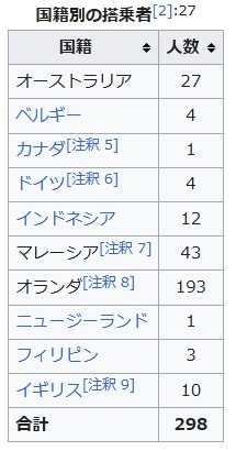 国籍別の搭乗者[2]:27 国籍 人数
