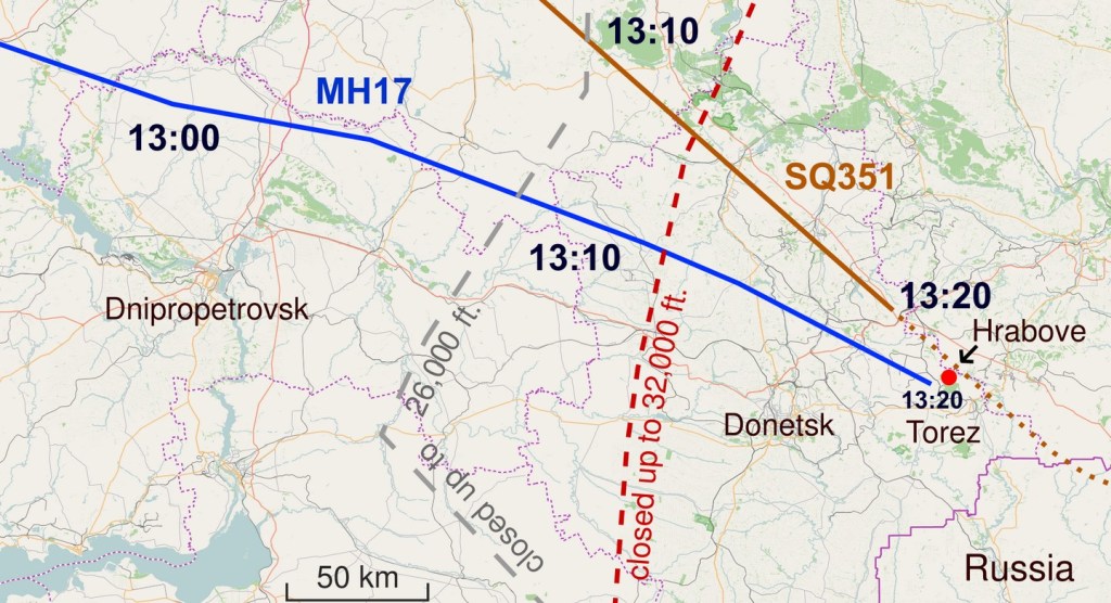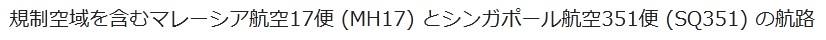 規制空域を含むマレーシア航空17便 (MH17) とシンガポール航空351便 (SQ351) の航路