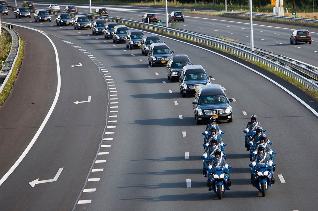 他の交通を停めてヒルフェルスムへと向かう霊柩車40台の車列