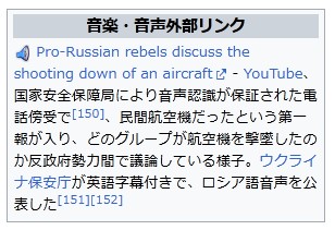 Pro-Russian rebels discuss the shooting down of an aircraft – YouTube、国家安全保障局により音声認識が保証された電話傍受で[150]、民間航空機だったという第一報が入り、どのグループが航空機を撃墜したのか反政府勢力間で議論している様子。ウクライナ保安庁が英語字幕付きで、ロシア語音声を公表した[151][152]