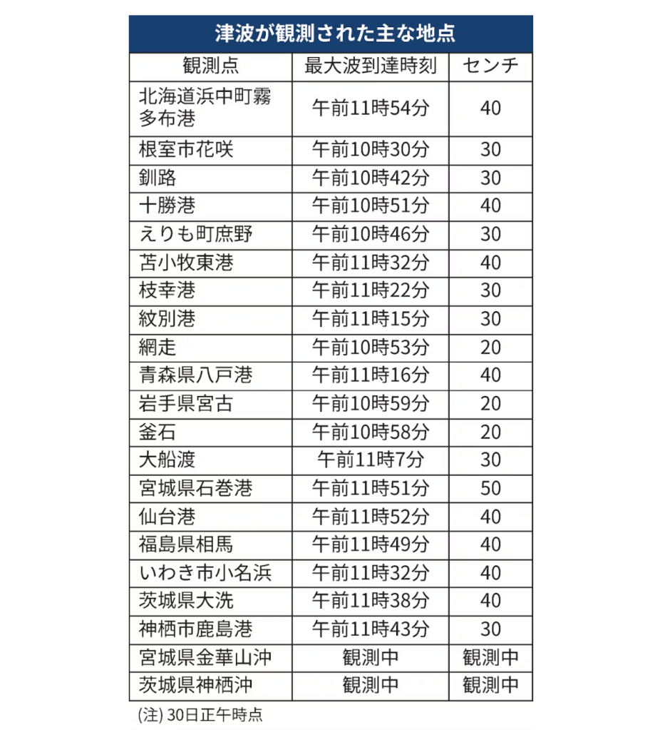 30日午前8時25分ごろ、ロシアのカムチャツカ半島付近でマグニチュード(M)8.7の地震が発生した。気象庁は太平洋側の広い範囲で津波警報と津波注意報を出した。予想される津波の高さは最大3メートルで、同日正午までに宮城県石巻市で50センチ、茨城県大洗町や北海道広尾町で40センチの津波を観測した。