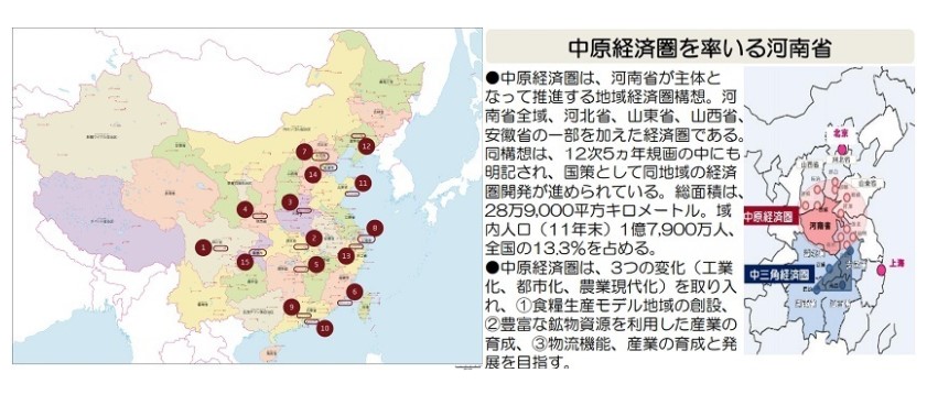 河南省は、河北省、山東省、山西省、安徽省の一部を加えた中原経済圏構想を担う主体として位置づけられ、国策として開発が進められてきましたけれども、河南省の省都である鄭州市は、中国の発展を支える意味で重要な役目を担っています。