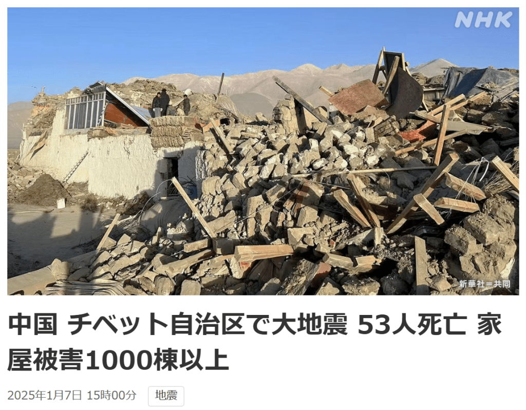 中国地震局によりますと、7日午前、チベット自治区のネパールとの国境近くでマグニチュード6.8の地震があり、国営メディアはこれまでに53人が死亡し、1000棟あまりの家屋で被害が出ていると伝えています。