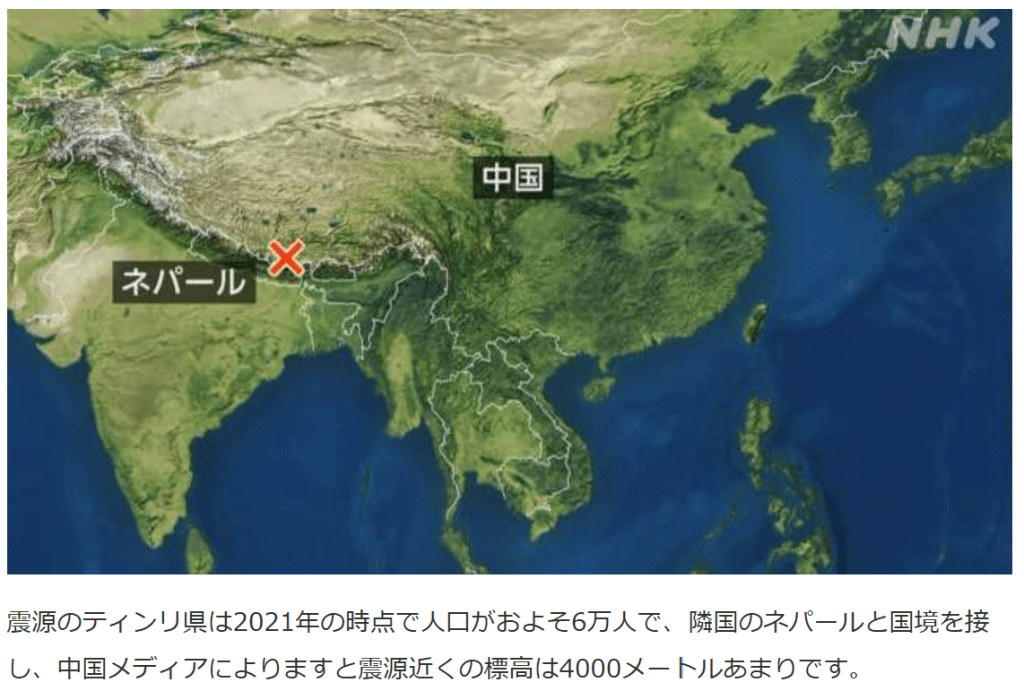 震源のティンリ県は2021年の時点で人口がおよそ6万人で、隣国のネパールと国境を接し、中国メディアによりますと震源近くの標高は4000メートルあまりです。