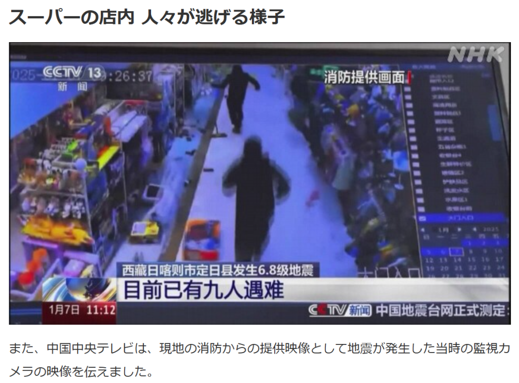 また、中国中央テレビは、現地の消防からの提供映像として地震が発生した当時の監視カメラの映像を伝えました。