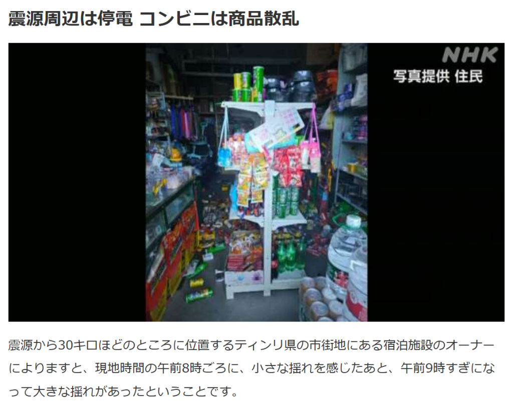 また、震源から60キロほど離れた場所にあるレストランの店員によりますと、大きな揺れで皿などの食器が次々と床に落下して割れたということです。現在はレストランの外に出て空き地に避難しているということです。』