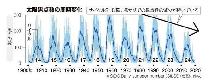 冒頭に乗せたグラフは太陽黒点の数です(2019年の産経新聞かは拝借)。黒点の出現数がだんだんと減っているのがお分かりになるかと思います。太陽黒点は11年周期で増減を繰り返しますが、1960年代の19サイクルをピークに太陽黒点の出現数は減り始めています。1970年代はイレギュラーに黒点の出現数が少ないサイクルですが、この当時、地球の気温は低く「氷河期が来る」と話題になりました。