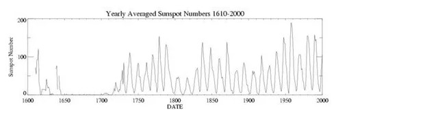 上のグラフは太陽黒点数の長期グラフです。14世紀半ばから19世紀半まで黒点数が少ない事が分かります。特に1645~1715年は太陽黒点数は極端に少なく、これを「マウンダー極小期」と呼びます。この間、地球は寒冷化しており、この時期のヨーロッパ、北米大陸、その他の温帯地域において冬は著しい酷寒に震え、夏らしさが訪れない年が続いた。地球の平均気温は今よりも1度~2度低下したのではないかとされている。
