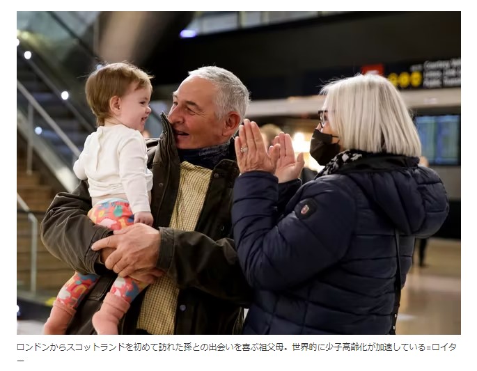 ロンドンからスコットランドを初めて訪れた孫との出会いを喜ぶ祖父母。世界的に少子高齢化が加速している=ロイター
