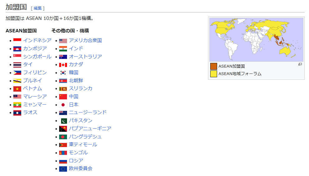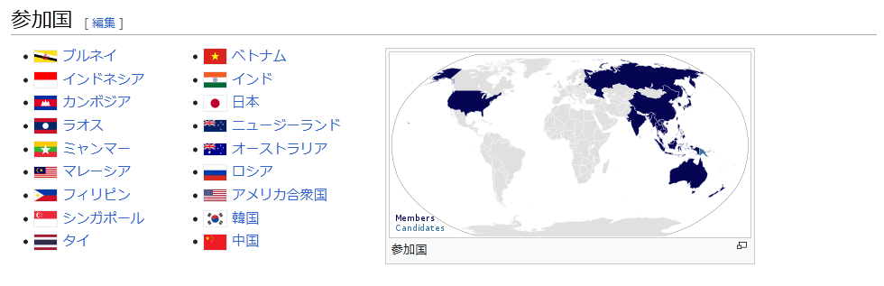 東南アジア諸国連合(ASEAN)10ヵ国、日中韓3ヵ国、オセアニア2ヵ国、インド1ヵ国の16ヵ国参加。
