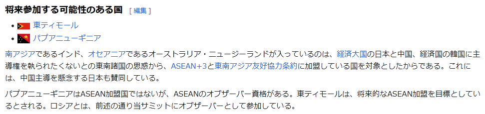パプアニューギニアはASEAN加盟国ではないが、ASEANのオブザーバー資格がある。東ティモールは、将来的なASEAN加盟を目標としているとされる。ロシアとは、前述の通り当サミットにオブザーバーとして参加している。