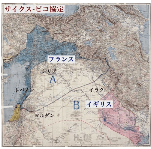 中東で石油が発見されると、イギリスとフランスはその利権を手に入れようとする。そして1916年に両国は協定を結ぶ。フランスのフランソワ・ジョルジュ・ピコとイギリスのマーク・サイクスが中心的な役割を果たしたことからサイクス-ピコ協定と呼ばれている。その結果、トルコ東南部、イラク北部、シリア、レバノンをフランスが、ヨルダン、イラク南部、クウェートなどペルシャ湾西岸の石油地帯をイギリスがそれぞれ支配することになっていた。