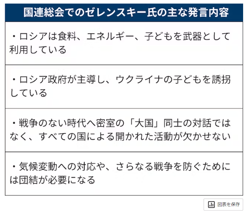 各国の賛同を得やすい環境問題も引き合いに出した。「人類が気候変動政策の目標を達成できていないにもかかわらず、モスクワが大規模な戦争を始め、数万の人々を殺害した」とも述べた。モロッコでの地震やリビアでの洪水を念頭に、気候変動や災害への対応がロシアによって遅延しかねないと批判した。