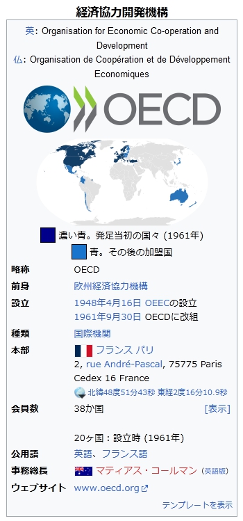 経済協力開発機構 英: Organisation for Economic Co-operation and Development 仏: Organisation de Coopération et de Développement Economiques 濃い青。発足当初の国々 (1961年) 青。その後の加盟国 略称 OECD