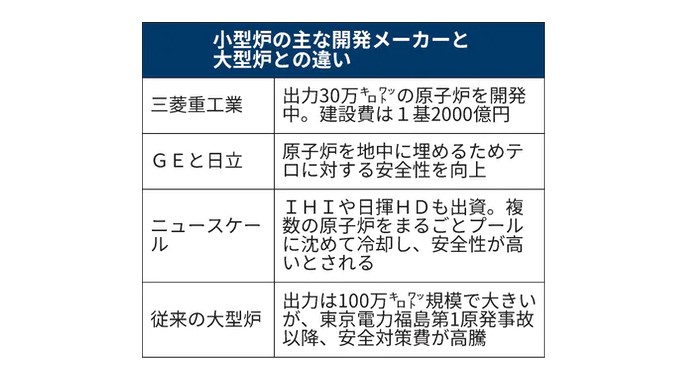 小型で熱を外に逃がしやすく、事故時に自然に冷却でき安全性に配慮しているとされる。発電の出力は30万キロワット程度と小さく、スケールメリットが効かないため通常の原発と比べて発電コストが下がりにくい。日立製作所と米ゼネラル・エレクトリック(GE)の原子力合弁会社や、米スタートアップのニュースケール・パワーなどが開発を進める。ニュースケールには日揮ホールディングス(HD)やIHIも出資している。