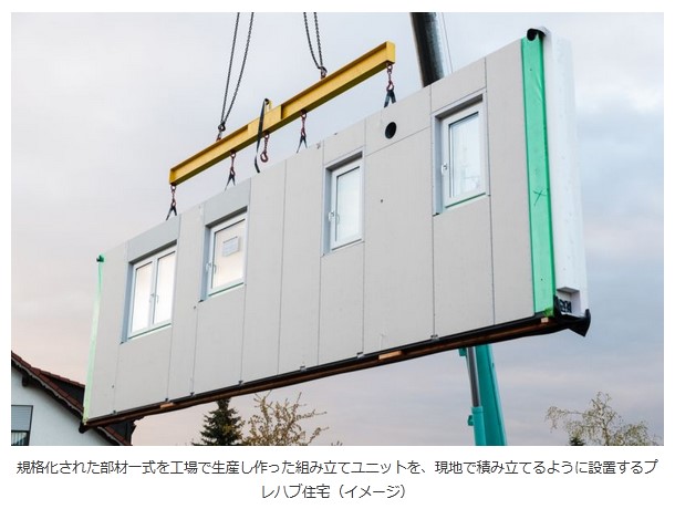規格化された部材一式を工場で生産し作った組み立てユニットを、現地で積み立てるように設置するプレハブ住宅(イメージ)