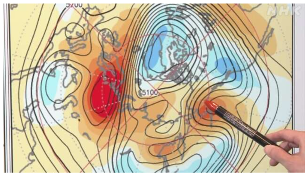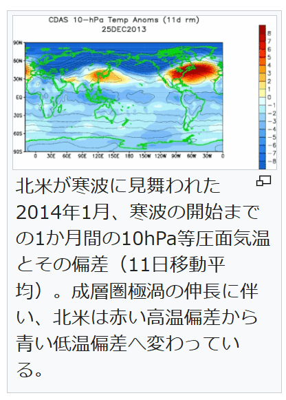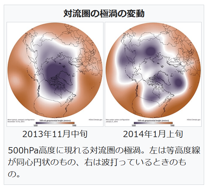 対流圏の極渦の変形は波打ち(伸長し)、その配置によっては寒気が移動してきた地域が寒波に見舞われる[6]。