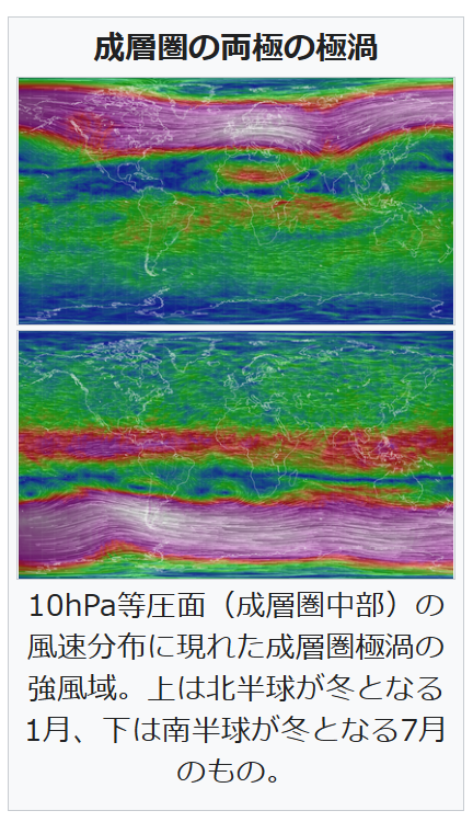 成層圏や中間圏では極渦内でこれを取り囲む強い西風の領域である極夜ジェット気流 (polar night jet stream)が吹く。