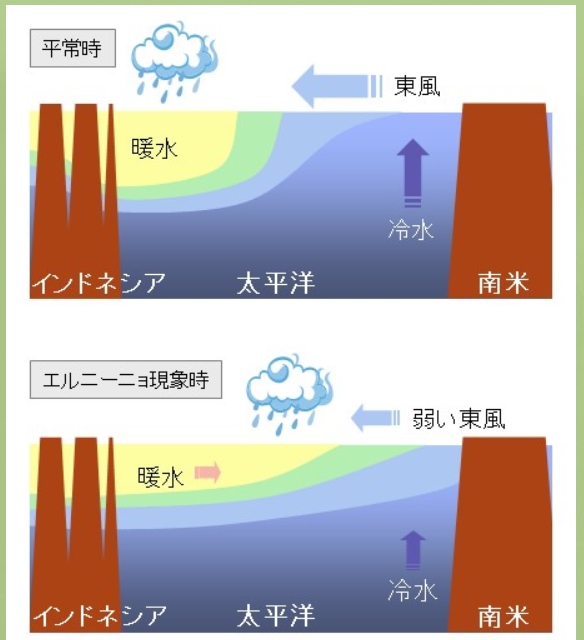 しかし、何らかの理由で貿易風が弱まると西側にたまっていた暖かい海水が東側に戻ってきます。