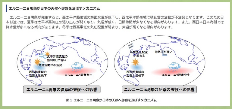 大まかにいうと、エルニーニョ現象は日本の気候の季節変化を小さくする傾向があり、ラニーニャ現象は大きくする傾向があります。