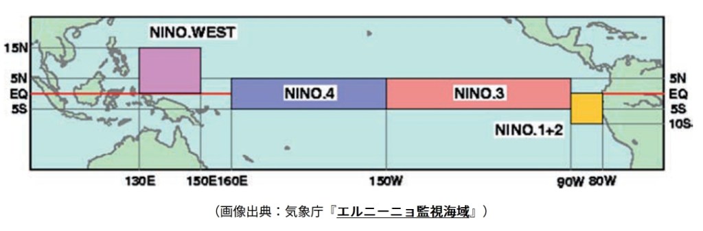 日本の気象庁では下図でNINO3と記されたエルニーニョ監視海域(南緯5度~北緯5度、西経150度~西経90度で囲まれる範囲)の海面水温で判断しています。