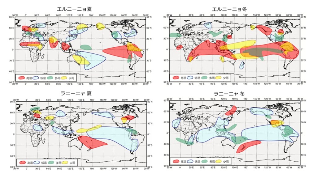 エルニーニョ現象発生時の6~8月(北半球の夏)の天候の特徴(左上)と、12~2月(北半球の冬)の天候の特徴(右上)、ラニーニャ現象発生時の6~8月(北半球の夏)の天候の特徴(左下)と、12~2月(北半球の冬)の天候の特徴(右下)。
