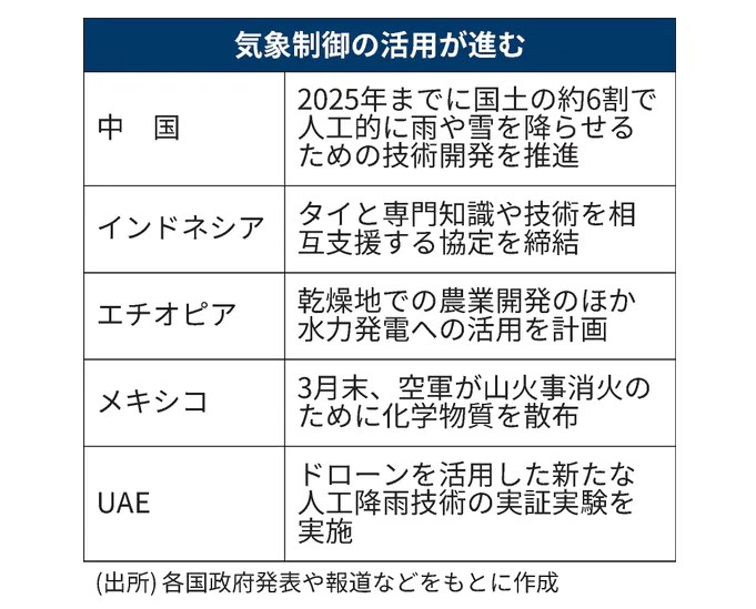 『一部の新興国が人為的に雨を降らせる技術などを使った「気象制御」に乗り出している。中国は2025年までに国土の約6割で人工降雨技術を活用する計画を立案し、エチオピアも乾燥地帯での農業開発に活用する。干ばつの減少や農業生産の拡大につなげる狙いだが、国際ルールは未整備で、地球環境への影響や国家間の水資源争奪を懸念する指摘が多い。