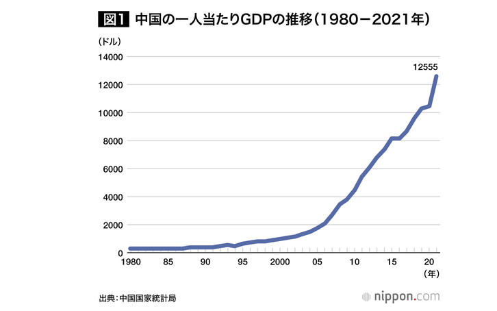 図1に示したのは、中国の一人当たり国内総生産(GDP)の推移である。ドル建ての一人当たりGDPであるため、為替レートの変動に影響されるが、中国経済が2000年代に入ってから本格的に離陸したことは確認できる。中国経済にとって2000-10年の間は高度成長期だった。