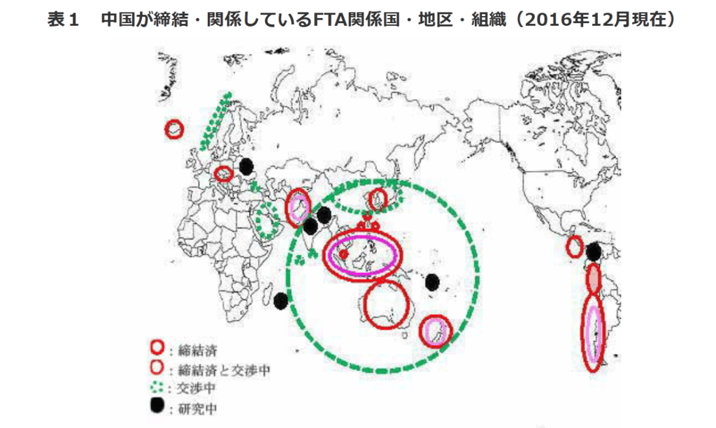 表1 中国が締結・関係しているFTA関係国・地区・組織(2016年12月現在)