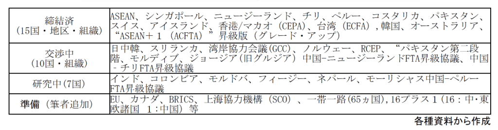 (15国・地区・組織) ASEAN、シンガポール、ニュージーランド、チリ、ペルー、コスタリカ、パキスタン、スイス、アイスランド、香港/マカオ(CEPA)、台湾(ECFA),韓国、オーストラリア、“ASEAN+1(ACFTA)”昇級版(グレード・アップ)