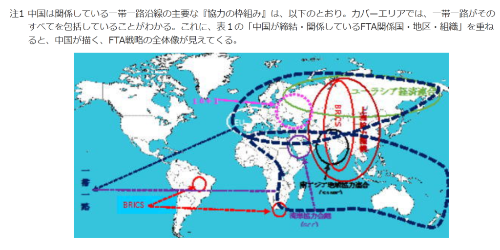 ○ 「一帯一路」と国家の対外戦略を密接に結びつけ~中略~周辺国・地区(関係国、以下同じ)に足場を築き、一帯一路に輻射する高水準のFTAネットワークを早急に形成させる(『FTA意見』の指導思想のところで言及)。