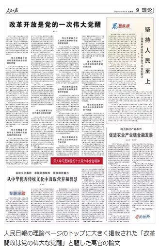 人民日報の理論ページのトップに大きく掲載された「改革開放は党の偉大な覚醒」と題した高官の論文