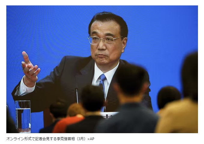 オンライン形式で記者会見する李克強首相(3月)=AP