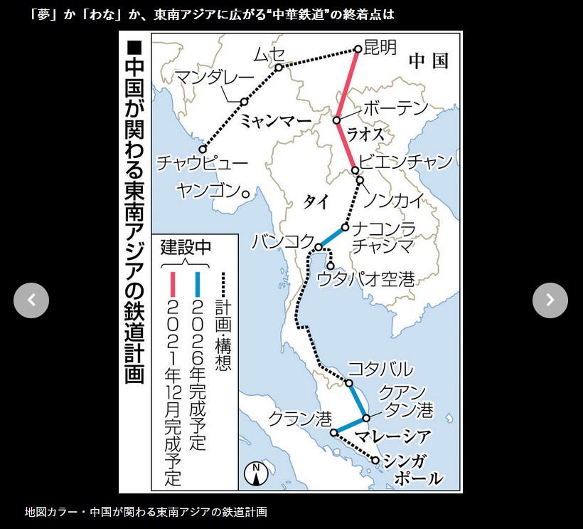 中国はミャンマーに対しても、昆明からミャンマー内陸部を抜けインド洋につながる鉄道建設を以前から働き掛けており、今年1月にはマンダレー―チャウピュー間の事業化調査を行うことで両政府が合意。直後の国軍クーデターで先行きは不透明になったが「中国にとってマラッカ海峡を避ける新たな交易ルートの大本命」(在東南アジア外交筋)との見方がある。
